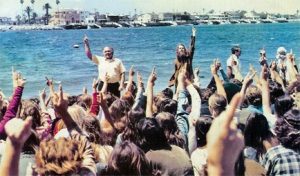 Chuck Smith and Lonnie Frisbee conduct a beach service and mass baptism at Corona Del Mar beach, 1970s