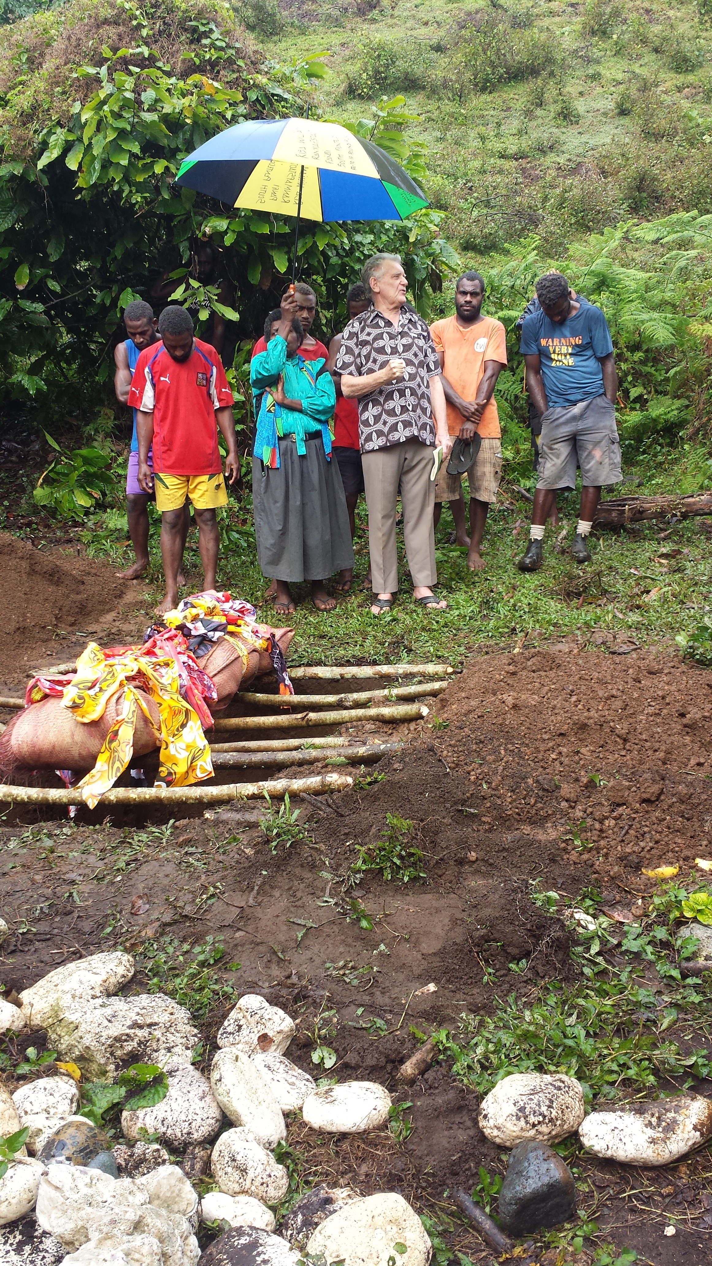 100 years ago a wife of the highest-ranking Paramount Chief died soon after native missionaries brought the Gospel to Pentecost Island. After her body was wrapped in burial calico the calico began moving. Quickly they unwrapped the body and she sat up. She had seen Jesus and told them all to leave their bad heathen ways and follow the good Christian way. Then she lay down and died again. They did what she said and moved from pagan villages to Christian villages on land offered by a Christian Chief who was the grandfather of Pastor Rolanson, our host.